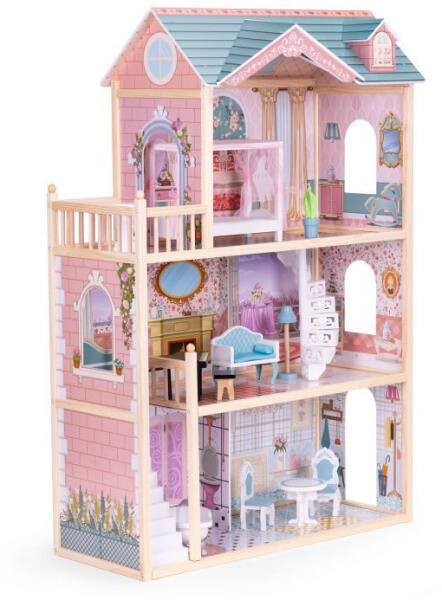 TÖKÉLETES BABAHÁZ Ez a babaház modell kétségtelenül a legjobb ajándék , amit gyermekének adhat. Minden lány álma , hogy játszhasson a babáival egy erre a célra kialakított házban. A ház a jól megválasztott színeknek és a különlegesen kialakított szobáknak köszönheti varázsát. Ez azt jelenti, hogy nemcsak a gyermeked szobájában, hanem a nappaliban is remekül fog mutatni, felkeltve az összes háztartástag örömét. NAGYSZERŰ SZÓRAKOZÁS Egyetlen pillanatnyi játék is elég ahhoz, hogy gyermeked imádja. Az egész ház 3 független szinttel rendelkezik, összesen 4 szobával - minden tökéletesen utánozza az igazi lakóházat. Minden szoba más stílusban készült , a dekoráció és a bútorok a szoba jellegéhez és céljához igazodnak. Azonban semmi sem állhat útjába annak, hogy gyermeked lakberendezőt játsszon, és a saját elképzelése szerint rendezze be a szobát. A készlet tartalmaz egy **11 darabos fabútort** is, amelyek szabadon átrendezhetők és elmozdíthatók mindenféle korlátozás nélkül. 3 SZINT ÉS EGY ERKÉLY Az első szinten található egy **fürdőszoba** és egy **konyha** bútorokkal és tűzhellyel. Az első két szintet fehér falépcső köti össze. Az első emeleten található egy **tágas nappali** kanapéval, dohányzóasztallal és hintaszékkel. Ugyanezen a szinten található egy kis **erkély** függőhintával. A legfelső emeleten egy csodálatos **hálószoba** található egy nagy ággyal és egy fésülködőasztallal. A szobák ilyen elrendezése korlátlan lehetőségeket kínál, és hosszú órákon át tartó kreatív játékot biztosít. A 15 SZÍNES BÚTORDARABBAN: